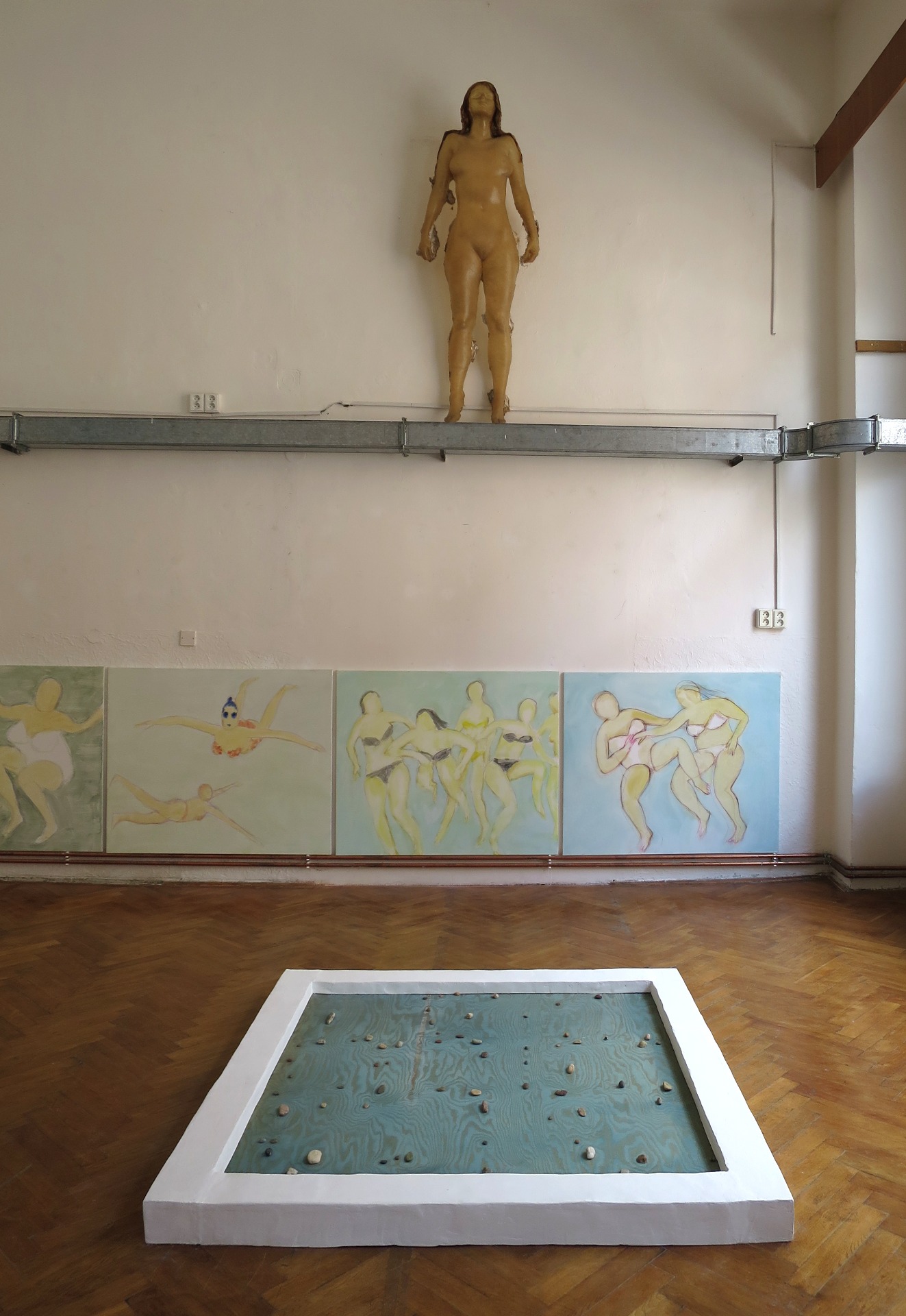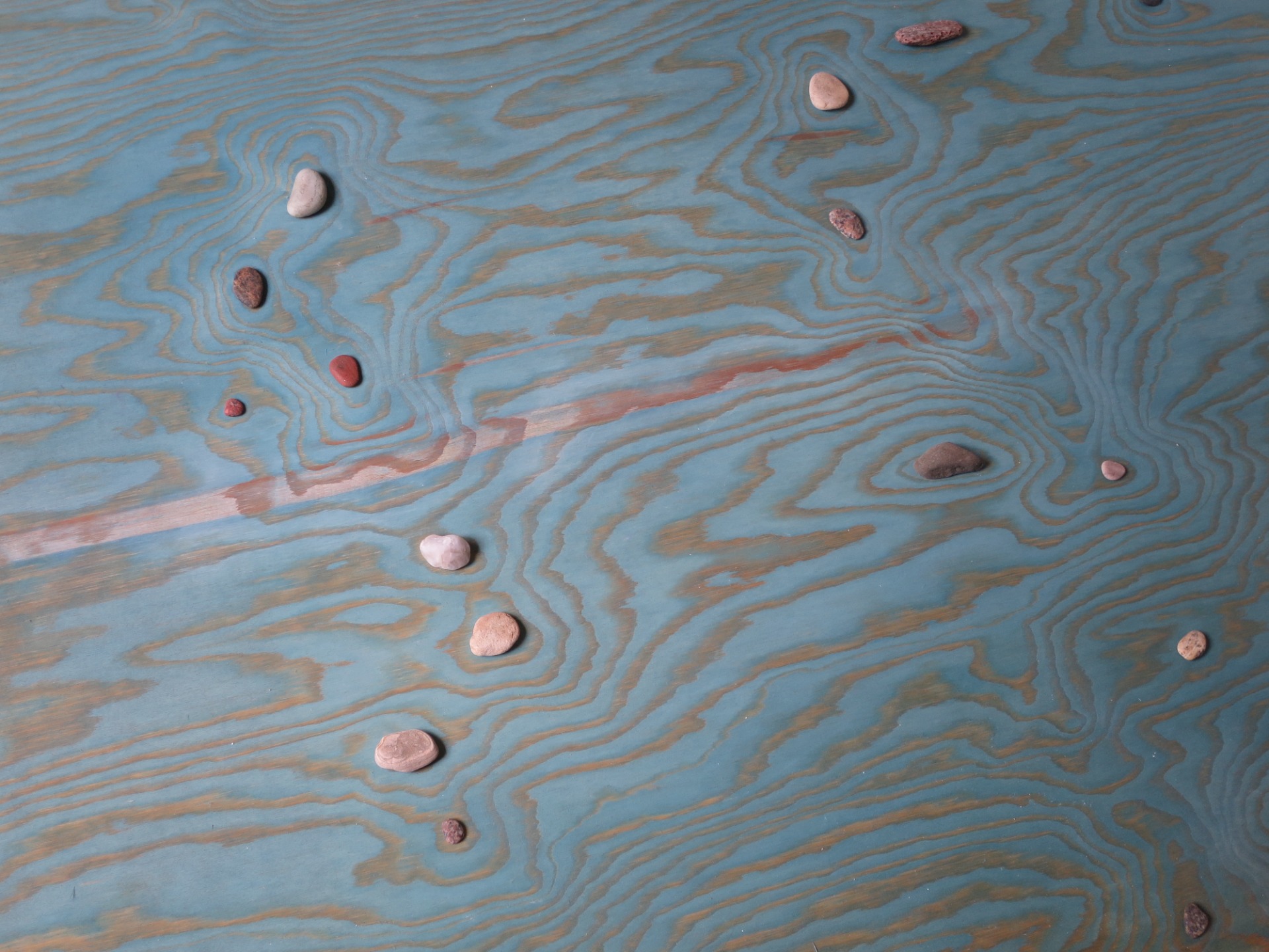 Ba-zen (altogether meaning "pool" with emphasis on "zen") is an extended version of my older pieces, where shapes of plywood are fitted with matching stones, resembling a flow of water or Japanese Zen garden patterns.