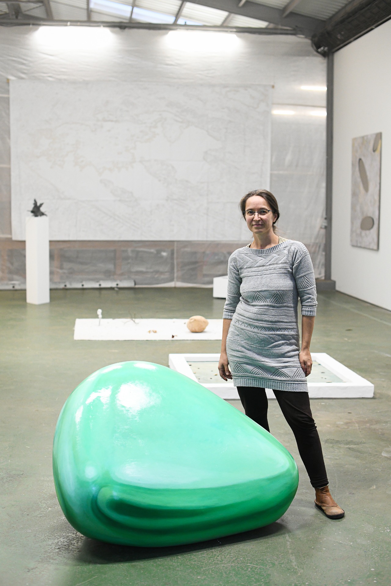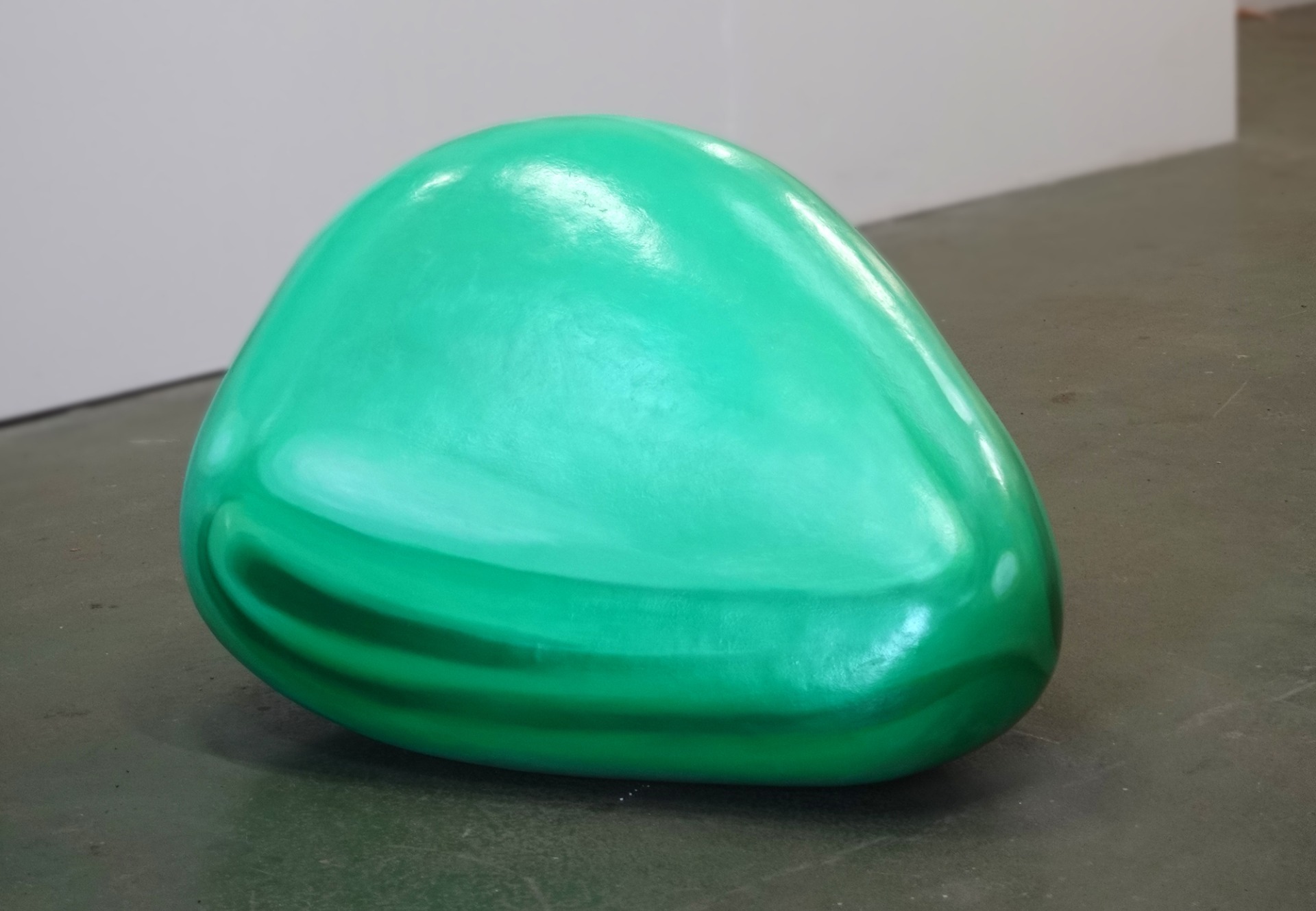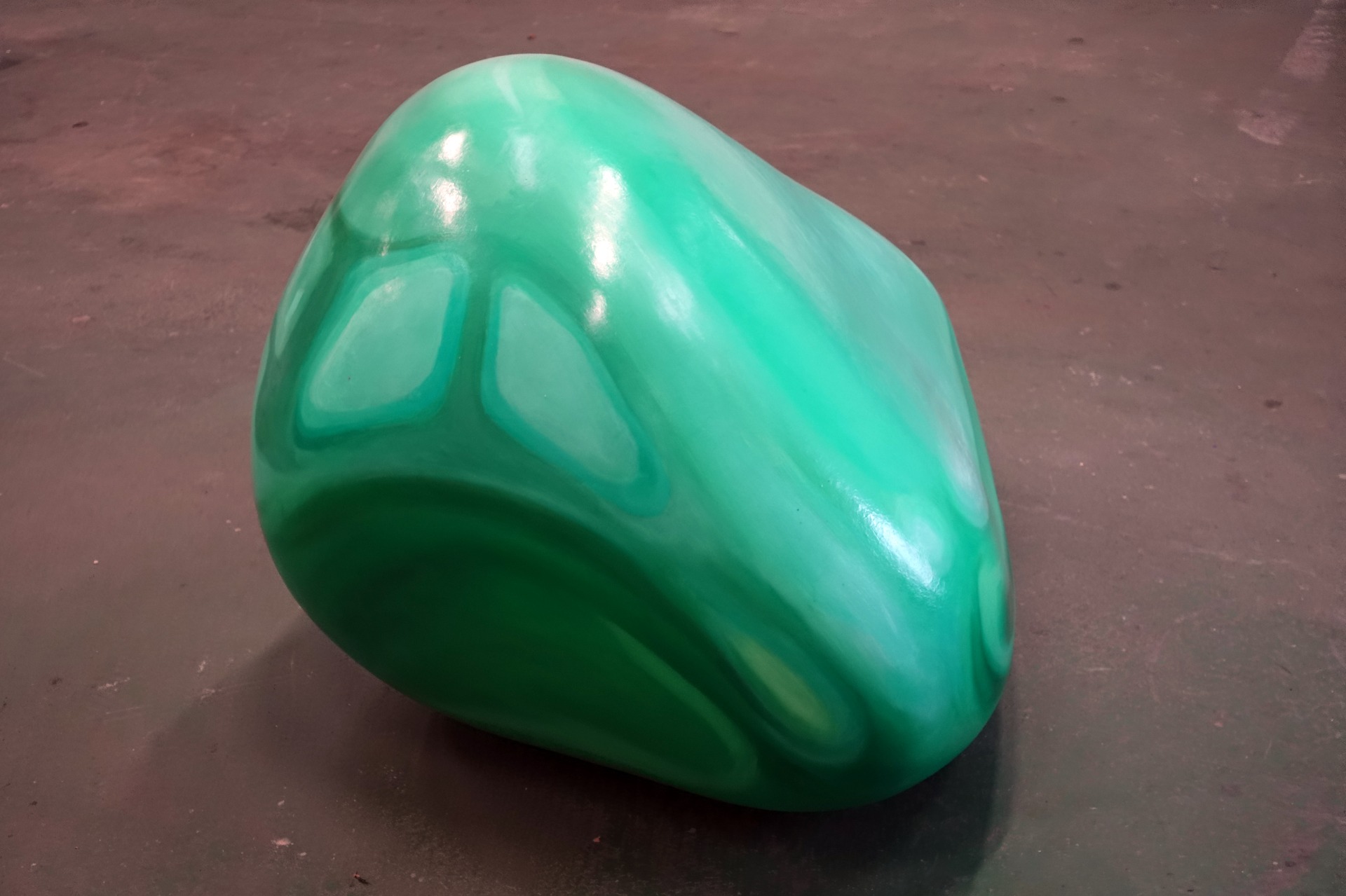 This piece is a first attempt in a more complex series of intended experiments called Space-Shift. The main aim is to create a reflection like painting a of a specific environment on top of a boulder shape, placed in a different environment than it is supposed to reflect. To achieve this, I made a model in Blender 3D software, and had the exact shape done in real size out of styrofoam with resin coatings. The computer image serves as a template for the painting. The reflection is blurred in order to balance on a certain point of ambiguity.